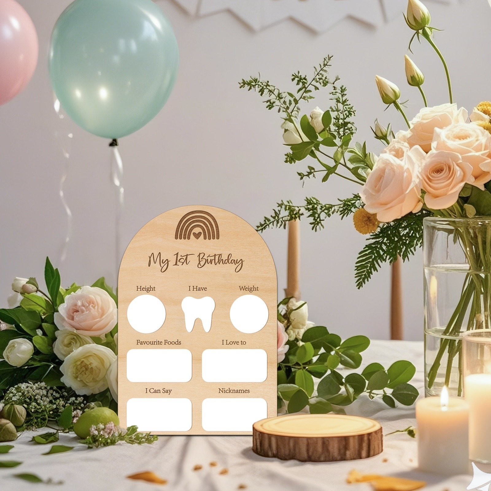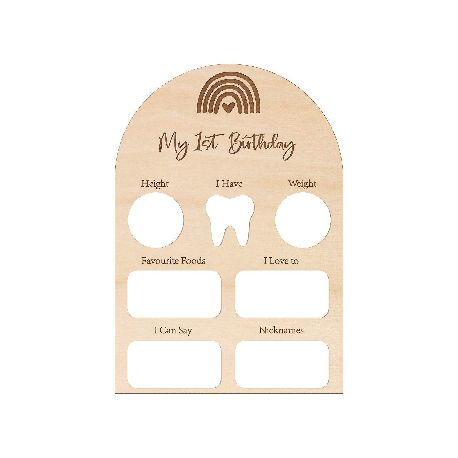 Make your baby’s first birthday extra special with this boho rainbow wooden sign. Featuring white acrylic details and engraved milestone sections, it’s perfect for capturing precious memories. Use it as a photo prop, party décor, or a treasured keepsake.